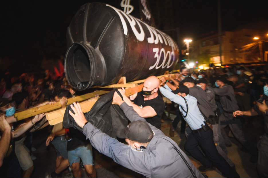 [1] צוללת שנוצרה מחביות פלסטיק חקלאיות בהפגנה בתל אביב. הצוללות סימלו את השחיתות שנתניהו מעורב בה, לפי ההאשמות, ונישאו בידי מפגינים בצורה שמזכירה מסע אלונקה צבאי. בתהלוכות הן היו לעיתים איל נגיחה מול ניסיונות המשטרה לחסום אותן. צילום: יאיר מיוחס, 10 באוקטובר 2020