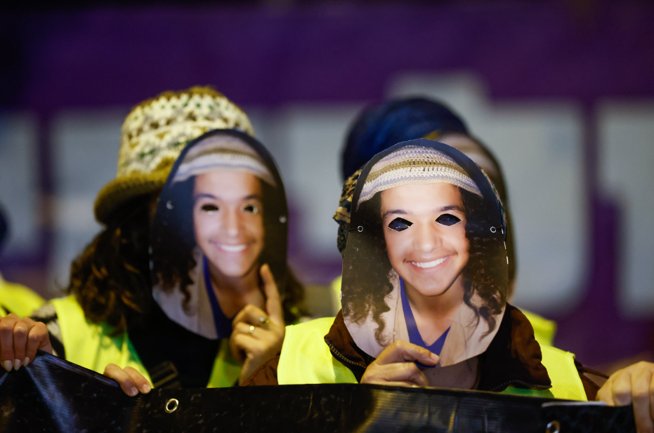 [2] מפגינים בירושלים מכסים את פניהם במסכות שעליהן פניו של אהוביה סנדק. מותו של סנדק שניסה להימלט מהמשטרה הוציא עשרות צעירים להפגין בירושלים בדרישה למצות את הדין עם השוטרים, ומחשש להתנכלות המשטרה הם הסתירו את פניהם במסכות. צילום: אוליבייה פיטוסי, 22 בפברואר, 2022[50]